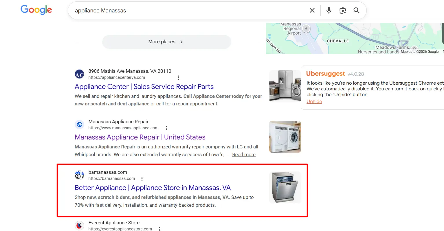However, many customers searching on Google Search for terms like appliance store Manassas VA, refurbished appliances near me, and scratch and dent appliances were often finding larger retailers first.