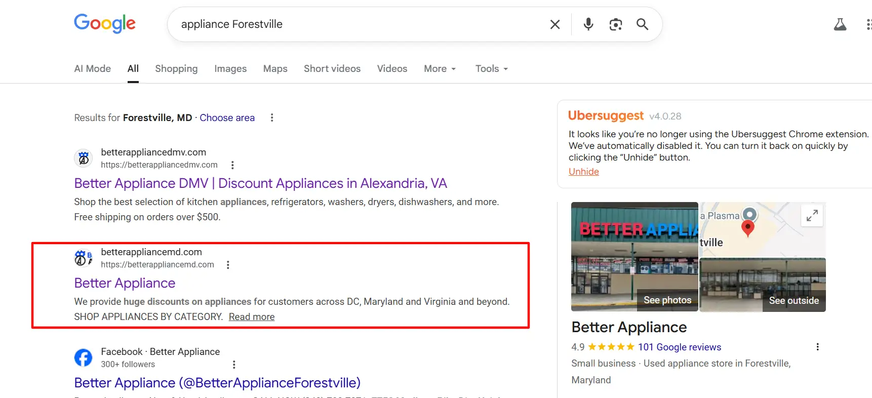 These improvements helped the website appear for nearby appliance searches.
