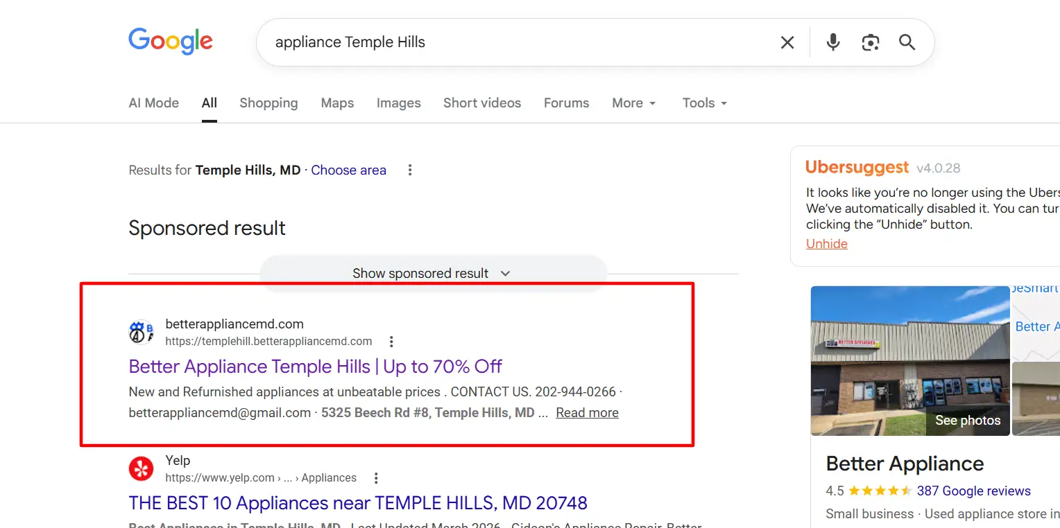 We helped Better Appliance MD reach 267K+ potential customers on Google.