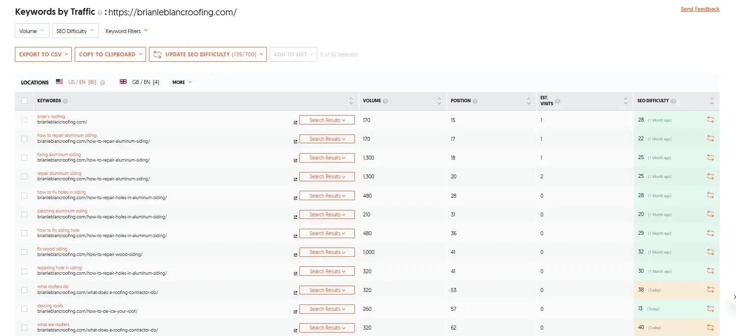 • 77 keywords ranking in Google, helping the business appear for more roofing-related searches